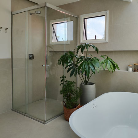A casa de mais de 40 anos recebeu tons terrosos e verdes para integrar o jardim ao interior. O teto pintado trouxe aconchego, enquanto móveis e objetos antigos foram preservados. A iluminação zenital foi valorizada, e elementos orientais ganharam novo olhar, adaptados às necessidades atuais de um casal de idosos.